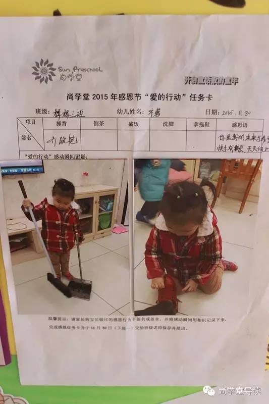 棒棒(4)班一位爸爸说道,“爱的行动”感恩节活动是一次非常好的体验,小朋友的责任心和宽容心得到了很好的培养!尚格幼儿园衷心的感谢家长对我们的支持,类似这样有意义的活动我们也会不断的开展!