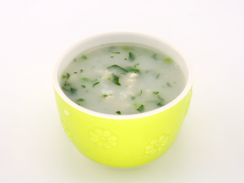 用料:米饭1/6碗、肉汤1/2杯、豆腐1/10块,盐适量