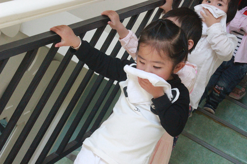 在全体教师和幼儿不知情的情况下,安全警报声突然响起。各组安全人员迅速跑出办公室指挥疏散幼儿和教师快速撤离火灾现场。正在进行活动的老师们听到警报声后带领幼儿拿起湿毛巾,捂住口鼻,低腰分两道楼梯快步下楼。很快孩子们集中到了操场安全地带,各班教师快速清点人数,并向总指挥报告。整个疏散过程只用了3分钟,做到了快速、安全、有序的撤离。